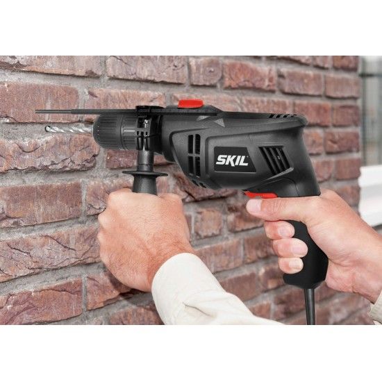 O berbequim de percussão de 550 W SKIL 1020 é a ferramenta ideal para todos os seus trabalhos de perfuração na bricolage dentro e fora de casa. O modo de martelo destina-se à perfuração em alvenaria e o mecanismo de martelo pode ser desligado para uma perfuração e um aparafusamento regulares. A velocidade variável com pré-seleção da velocidade proporciona-lhe versatilidade e controlo sobre o seu trabalho. Para sua comodidade, pode bloquear o interruptor para uma perfuração e um aparafusamento contínuos. Este berbequim de percussão tem uma bucha de aperto rápido semiautomática de 13 mm para uma mudança de acessórios rápida e simples. Pode usar a pega lateral para controlo confortável com as duas mãos e o batente de profundidade para definir a profundidade de perfuração para furos cegos.