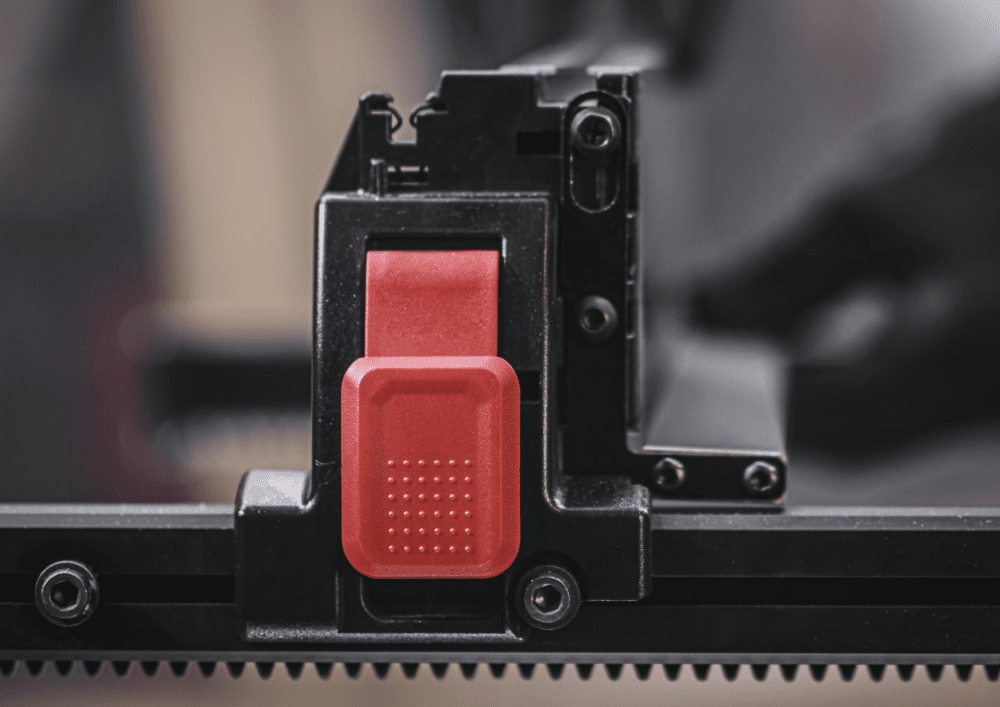 - O carril de cremalheira e pinhão torna o ajuste da régua rápido, suave e preciso