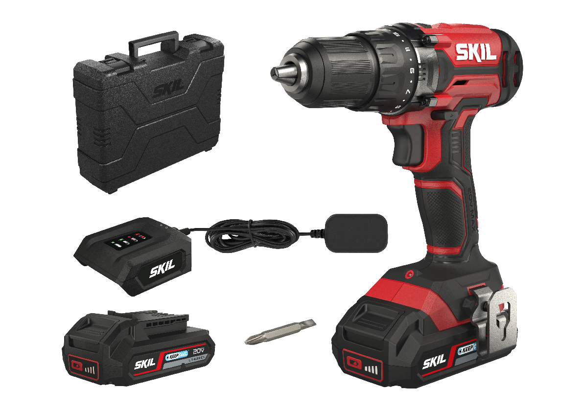A SKIL 3008 HA é fornecida numa mala de transporte robusta, com duas baterias “20V Max” (18 V) de 2,0 Ah “Keep Cool™”, um carregador, uma ponta de aparafusar dupla e um clip de cinto.