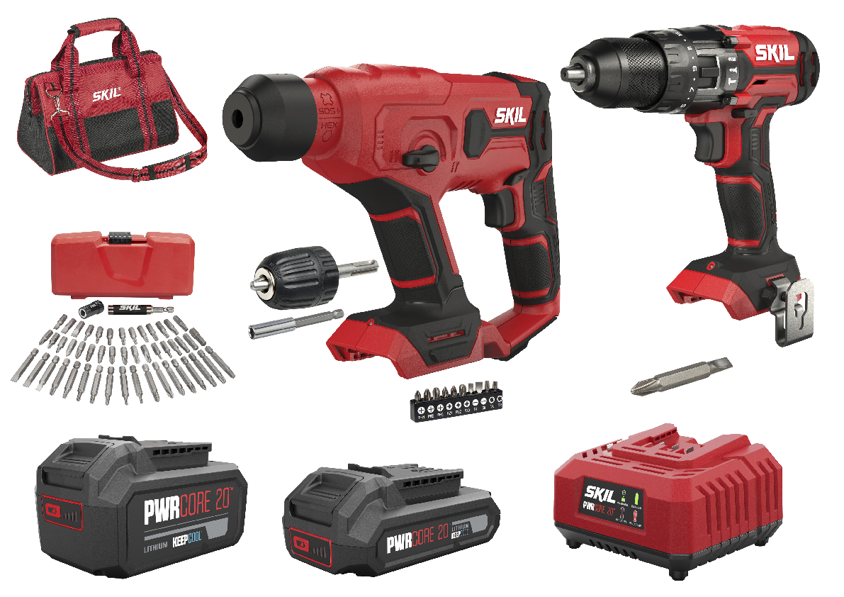 A aparafusadora/berbequim de percussão sem fio SKIL 3020 «20V Max» com função de impacto é ideal para perfuração em madeira, metal e mesmo em alvenaria e para os trabalhos de aparafusamento mais exigentes. Os 17 ajustes de binário asseguram resultados de aparafusamento precisos. Graças ao seletor de funções, pode alternar facilmente entre aparafusamento, perfuração e perfuração com percussão. Dispõe de duas velocidades que poderá utilizar para perfuração rápida ou para aplicações exigentes de perfuração e aparafusamento. O SKIL 3810 «20V Max» é um martelo rotativo 3 em 1 compacto, mas potente para perfuração em betão, assim como para trabalhos normais de perfuração e aparafusamento. Utilize o mecanismo de martelo para perfurar em betão e desligue o mecanismo para uma perfuração e um aparafusamento regulares. Este martelo rotativo sem fio é compatível com brocas «SDS+» e com brocas sextavadas e pontas de aparafusamento normais. Como todas as outras ferramentas sem fio SKIL «20V Max», estes modelos são alimentados pela tecnologia avançada de bateria e carregador líder na indústria «PWRCORE 20™». O jogo combinado SKIL 3313 EA com duas ferramentas é fornecido num saco de transporte com uma bateria «KEEPCOOL™» de 2,0Ah, uma bateria «KEEPCOOL™» de 4,0Ah, um carregador rápido, dois porta-pontas magnéticos, um colar de aperto de ponta magnética «BIT GRIP™», uma bucha de aperto rápido com adaptador «SDS+», um jogo de 58 pontas de aparafusamento e um clipe de fixação ao cinto.